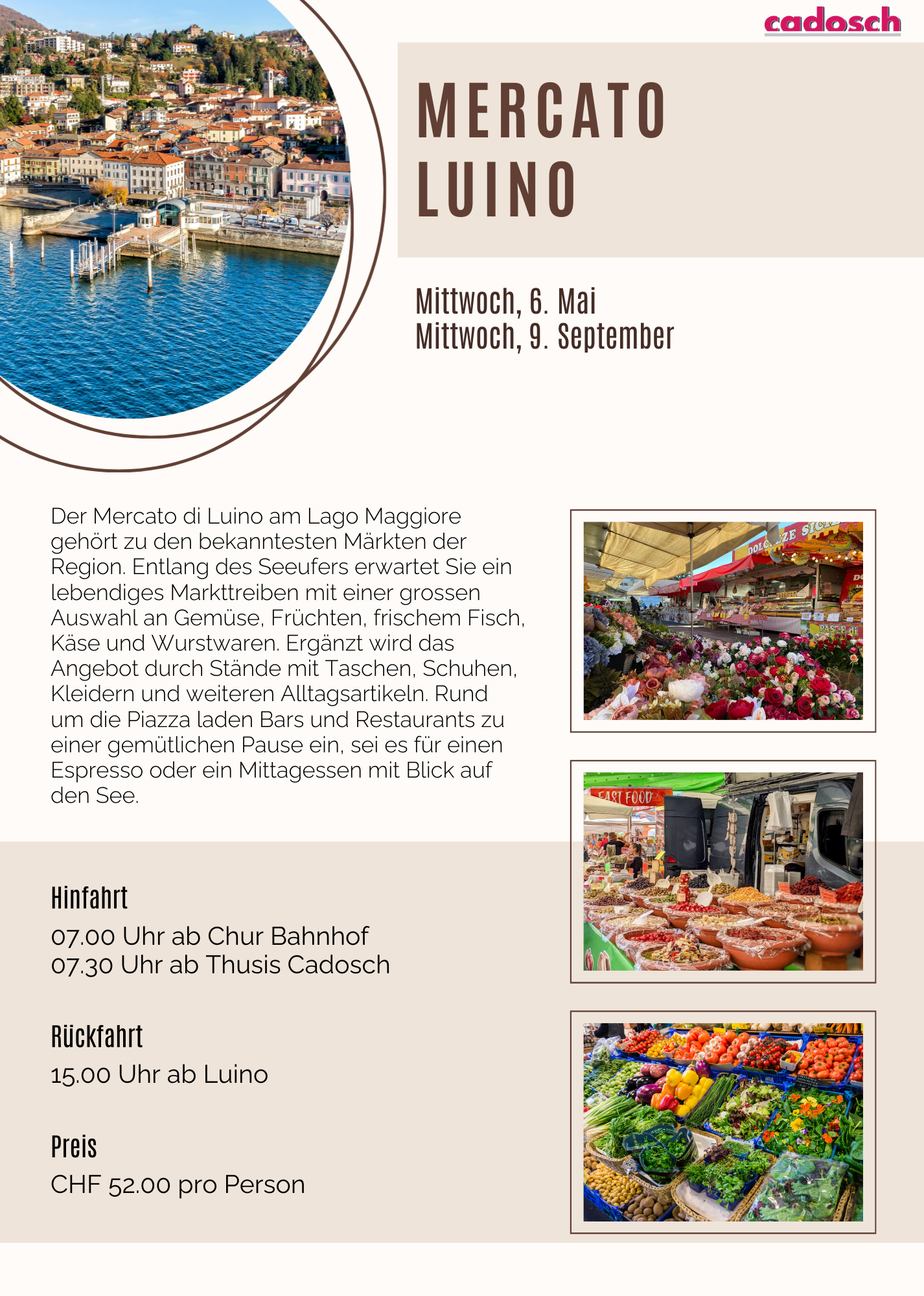 Der Mercato di Luino am Lago Maggiore gehört zu den bekanntesten Märkten der Region. Entlang des Seeufers erwartet Sie ein lebendiges Markttreiben mit einer grossen Auswahl an Gemüse, Früchten, frischem Fisch, Käse und Wurstwaren. Ergänzt wird das Angebot durch Stände mit Taschen, Schuhen, Kleidern und weiteren Alltagsartikeln. Rund um die Piazza laden Bars und Restaurants zu einer gemütlichen Pause ein, sei es für einen Espresso oder ein Mittagessen mit Blick auf den See.