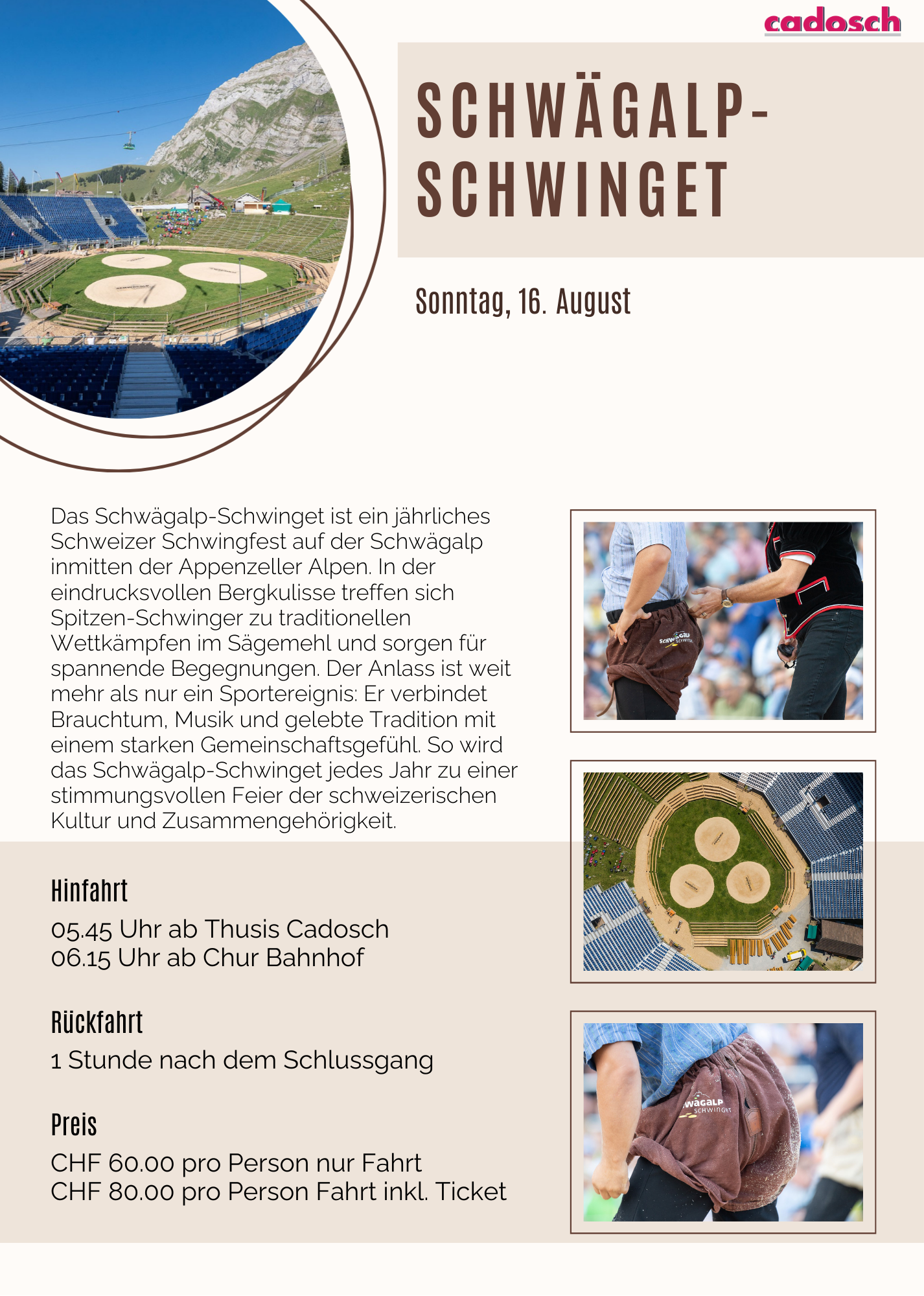 Das Schwägalp-Schwinget ist ein jährliches Schweizer Schwingfest auf der Schwägalp inmitten der Appenzeller Alpen. In der eindrucksvollen Bergkulisse treffen sich Spitzen-Schwinger zu traditionellen Wettkämpfen im Sägemehl und sorgen für spannende Begegnungen. Der Anlass ist weit mehr als nur ein Sportereignis: Er verbindet Brauchtum, Musik und gelebte Tradition mit einem starken Gemeinschaftsgefühl. So wird das Schwägalp-Schwinget jedes Jahr zu einer stimmungsvollen Feier der schweizerischen Kultur und Zusammengehörigkeit.