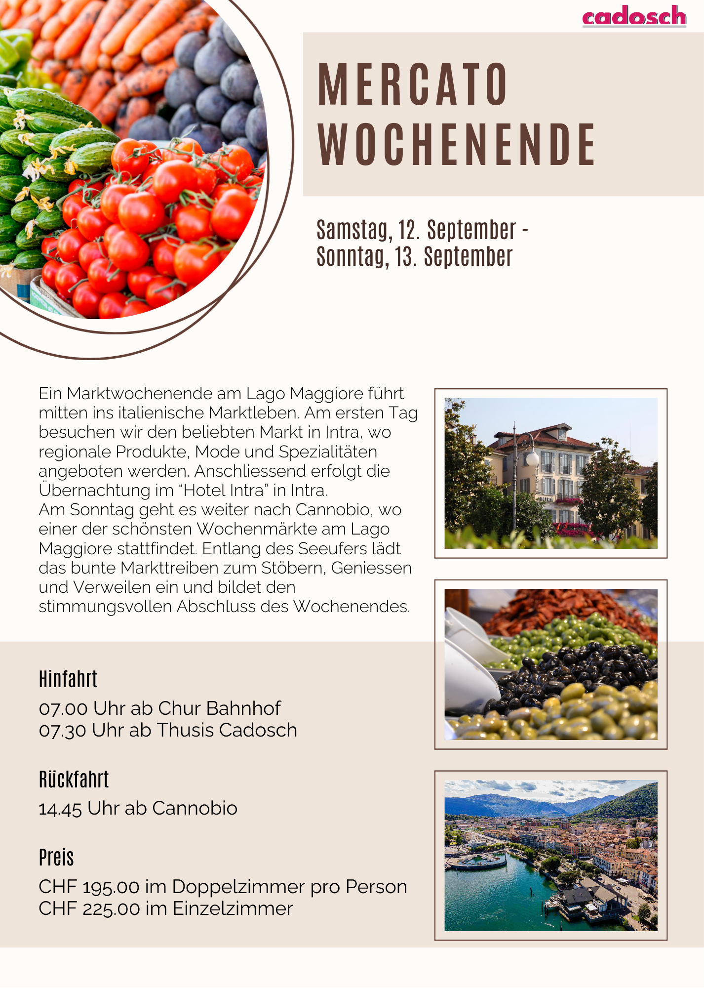 Ein Marktwochenende am Lago Maggiore führt mitten ins italienische Marktleben. Am ersten Tag besuchen wir den beliebten Markt in Intra, wo regionale Produkte, Mode und Spezialitäten angeboten werden. Anschliessend erfolgt die Übernachtung im “Hotel Intra” in Intra.