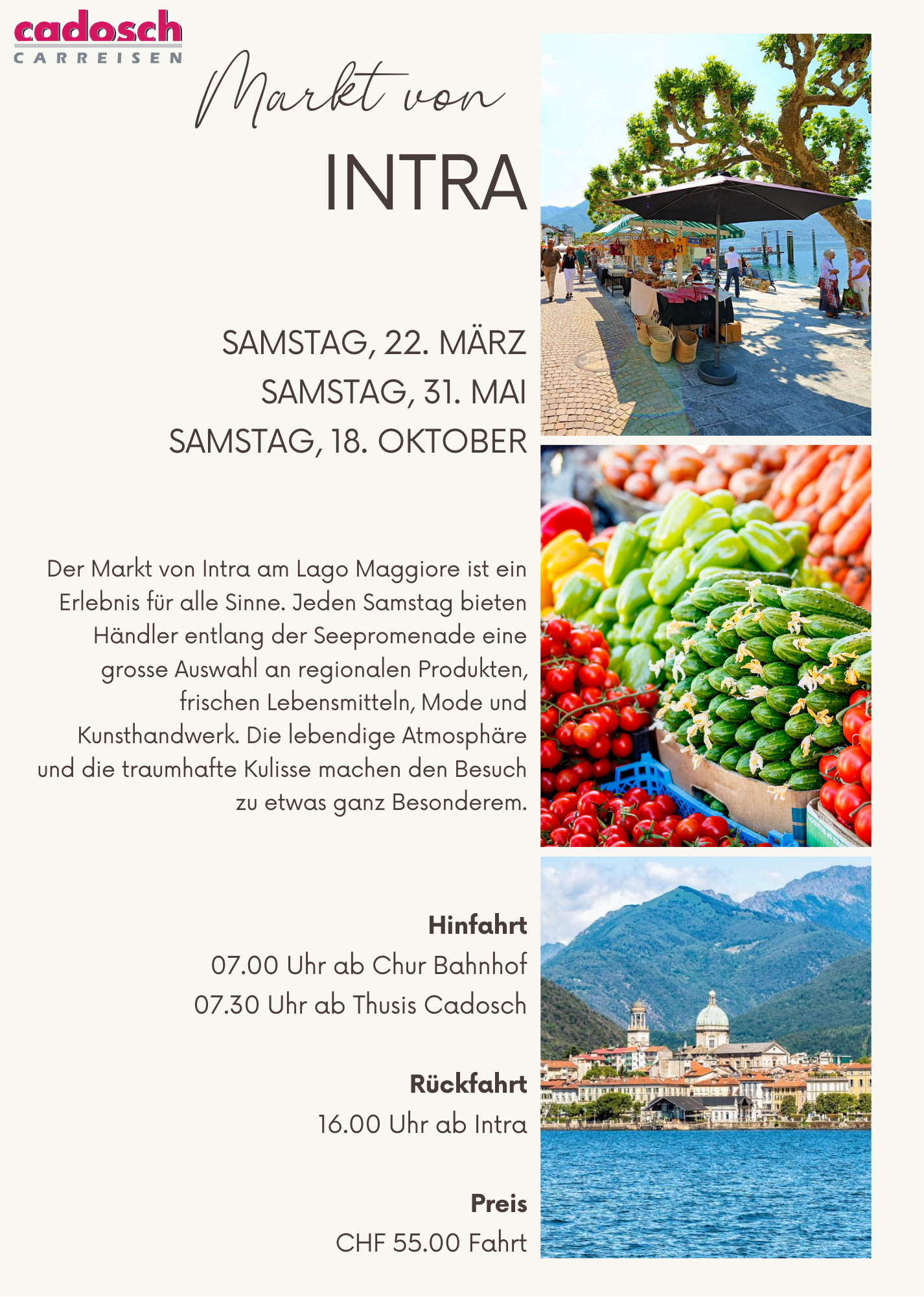 Jeden Samstag bieten Händler entlang der Seepromenade eine grosse Auswahl an regionalen Produkten, frischen Lebensmitteln, Mode und Kunsthandwerk. Die lebendige Atmosphäre und die traumhafte Kulisse machen den Besuch zu etwas ganz Besonderem.