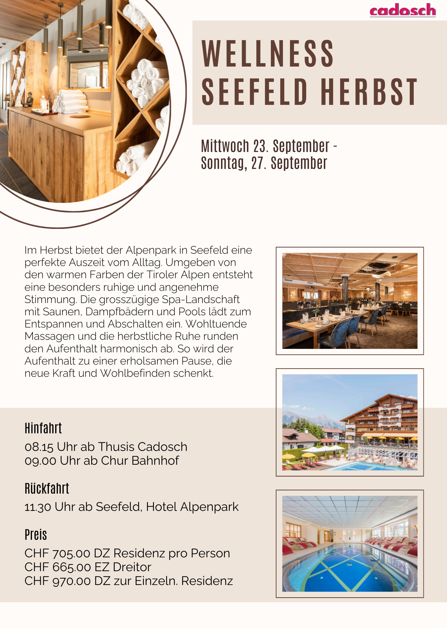 Im Herbst bietet der Alpenpark in Seefeld eine perfekte Auszeit vom Alltag. Umgeben von den warmen Farben der Tiroler Alpen entsteht eine besonders ruhige und angenehme Stimmung. Die grosszügige Spa-Landschaft mit Saunen, Dampfbädern und Pools lädt zum Entspannen und Abschalten ein. Wohltuende Massagen und die herbstliche Ruhe runden den Aufenthalt harmonisch ab. So wird der Aufenthalt zu einer erholsamen Pause, die neue Kraft und Wohlbefinden schenkt.